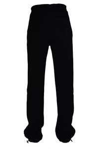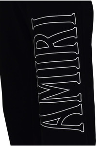 Black cotton Amiri jogging pants. Vertical logo print with white outlines on one leg. Elastic waistband with white drawstrings. Black logo patch on back. Side pockets. One back pocket. Elastic ankles with drawstrings. Made in Italy.