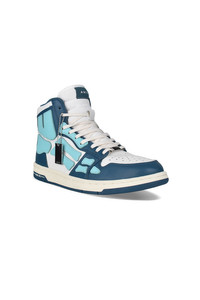 Skel Top Amiri high-top sneakers in blue and white leather. Sky-blue leather inserts forming a skeleton. White nylon tongue with logo. Metal logo plaque at front. Blue and white thin rubber sole with logo. White laces. Round toe.