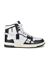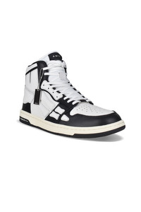 Skel Top Amiri high-top sneakers in black and white leather. White leather inserts forming a skeleton. White nylon tongue with logo. Metal logo plaque at front. Black and white thin rubber sole with logo. White laces. Round toe.