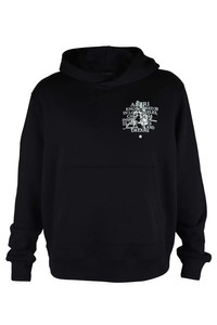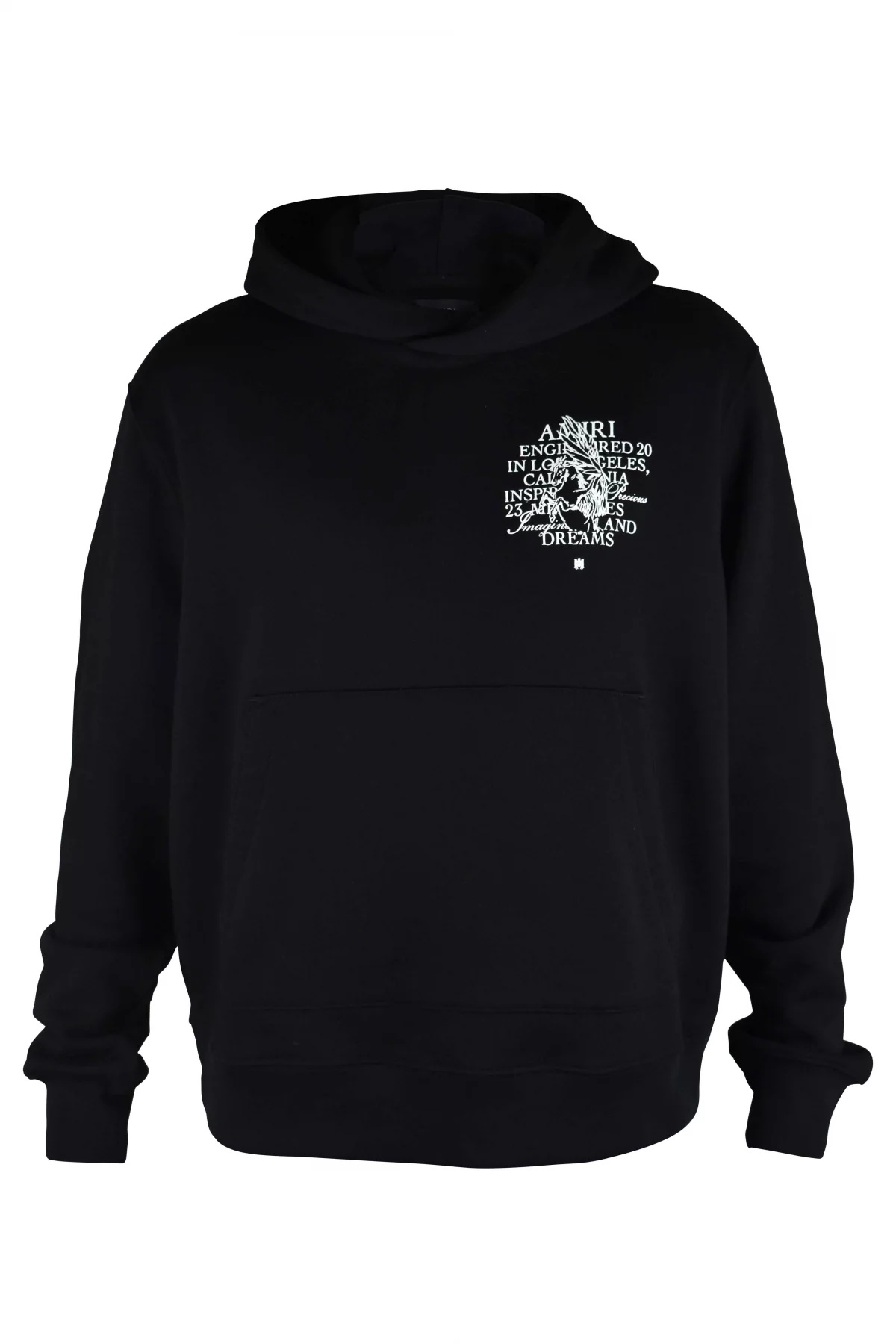 Precious Memories Amiri hooded sweatshirt in black cotton. Graphic print and white lettering on chest. Graphic print and white lettering on back. Front kangaroo pocket. Ribbed edges. Made in Italy.