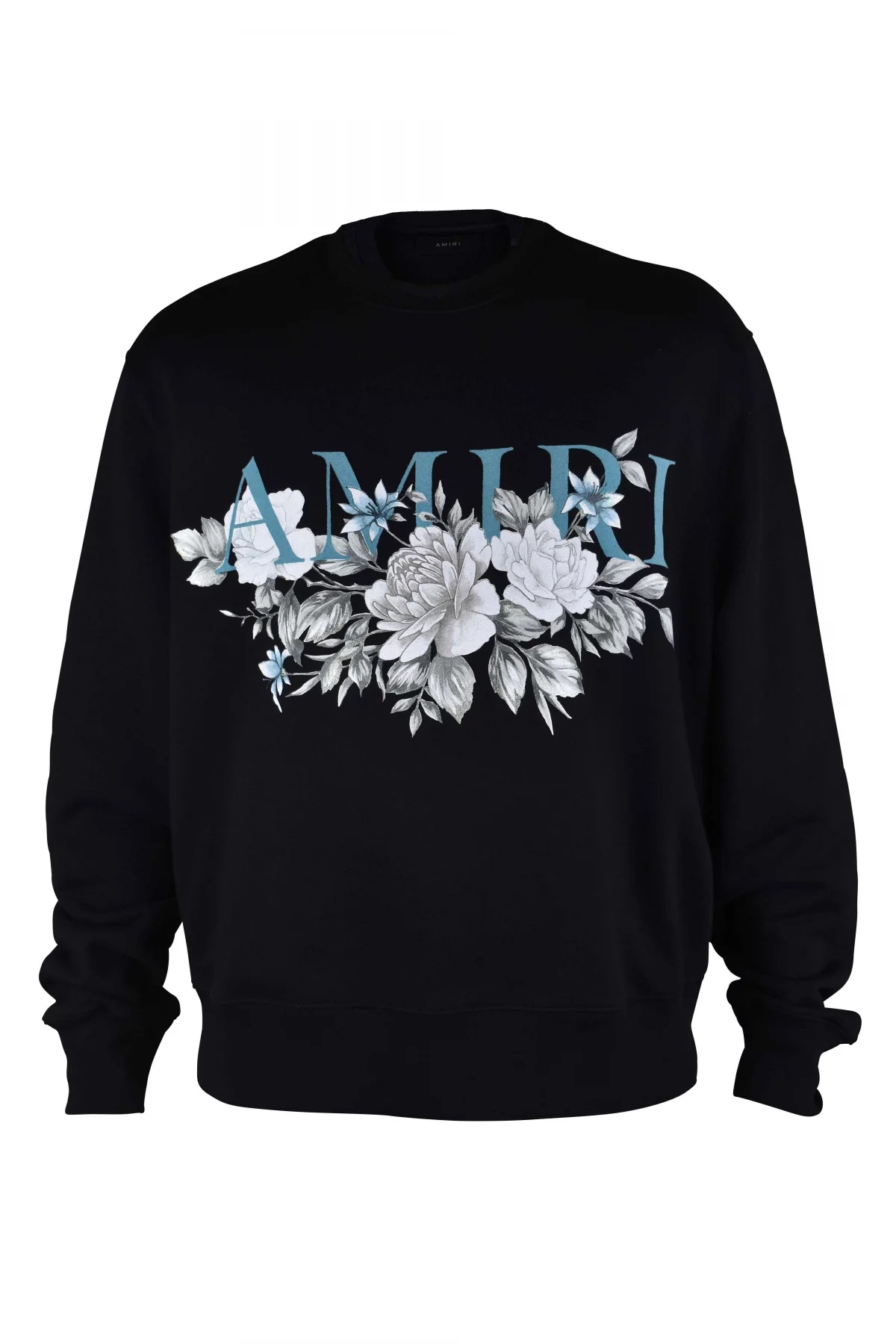 Amiri sweatshirt in black cotton. Turquoise blue logo printed in center. Graphic white flower print at center. Round collar. Ribbed edges. Made in Italy.