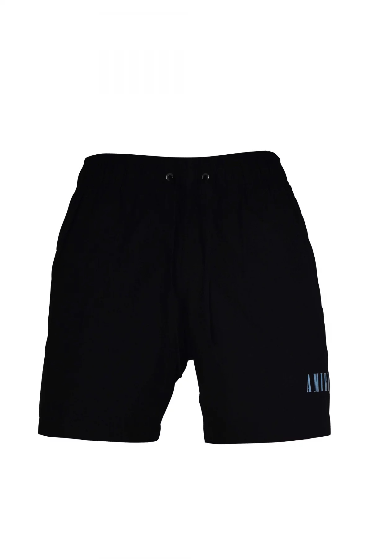 Black polyester and elastane Amiri swim shorts. Blue “Amiri” logo printed on bottom. Elasticated waist with drawstrings. Side pockets. One back pocket with scratch closure. Black logo patch on back.