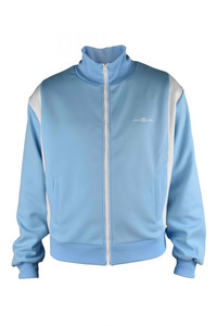 Amiri vest in light blue polyester. White logo print on chest. White “Amiri” printed on back. White details on sides. Side pockets. Main zip closure. Ribbed sleeve edges. Elastic waistband. Black logo patch on back elastic. High collar. Made in Italy.
