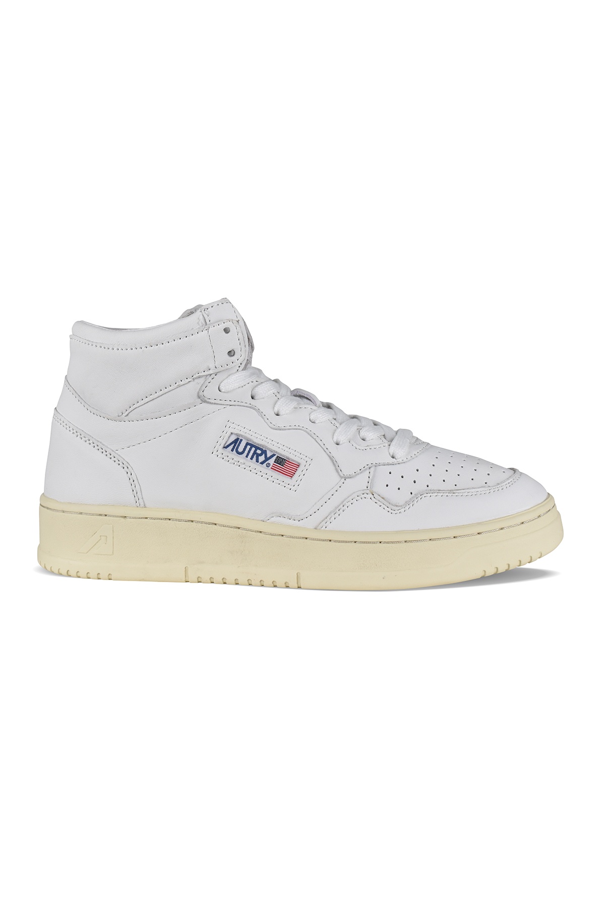 Autry "Medalist Mid" high-top sneakers in white leather. Logo patch on outside. Tongue with logo patch. Yellowed-effect rubber sole. Lace-up closure. Perforated round toe. 100% leather.