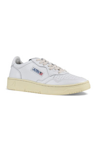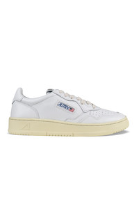 Autry low-top sneakers in white leather. Logo patch on outer side. White leather counter with embossed logo. Tongue with logo patch. Yellowed-effect rubber sole. Lace-up closure. Perforated round toe. 100% leather.