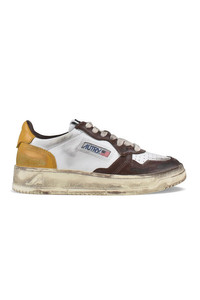Autry low-top sneakers in white and yellow leather. Logo patch on outer side. Yellow leather counter with embossed logo. Tongue with logo patch. Yellowed-effect rubber sole. Lace-up closure. Perforated round toe. 100% leather.