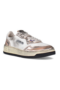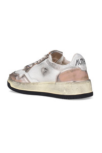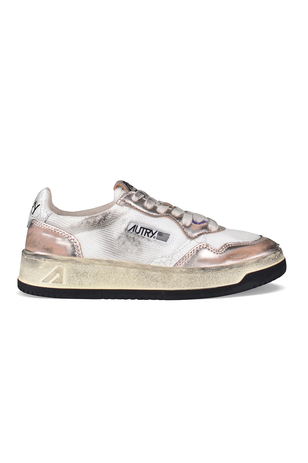 Super vintage Autry low sneakers. In old-pink laminated leather and white canvas. Worn effect. Purple leather details. Logo patch on outer side. Cracked white leather counter and embossed logo. Tongue with logo patch. Vintage yellowed-effect rubber sole. Beige flat lace closure. Perforated round toe. 100% leather.