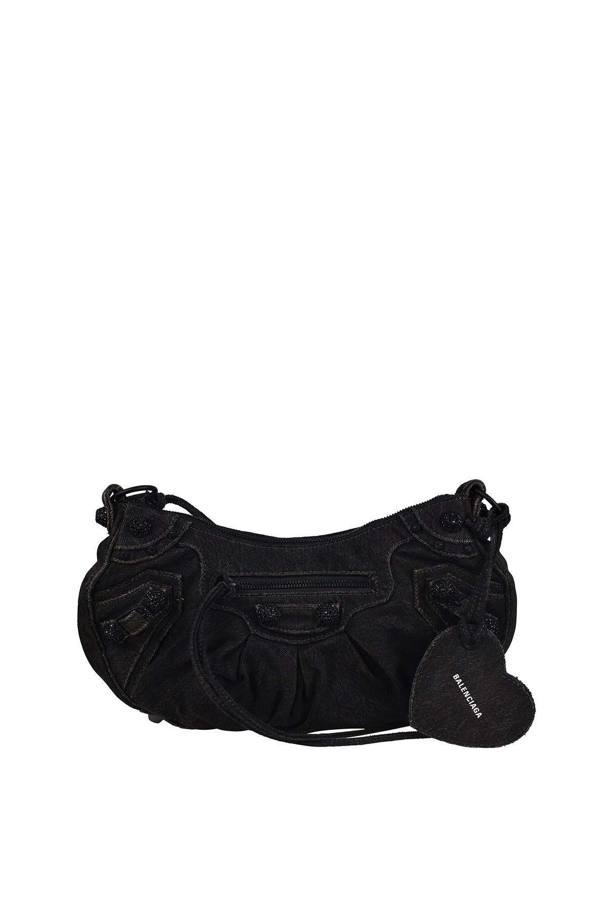 Balenciaga Cagole bag in black denim canvas. Faded effect. Black rhinestone trim. Adjustable shoulder strap. Shoulder bag. Main zipper closure. Front pocket with zip closure. Back pocket with zip closure. Removable heart-shaped mirror. Dimensions: 33 x 17 x 8 cm. Made in Italy.