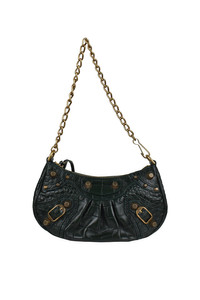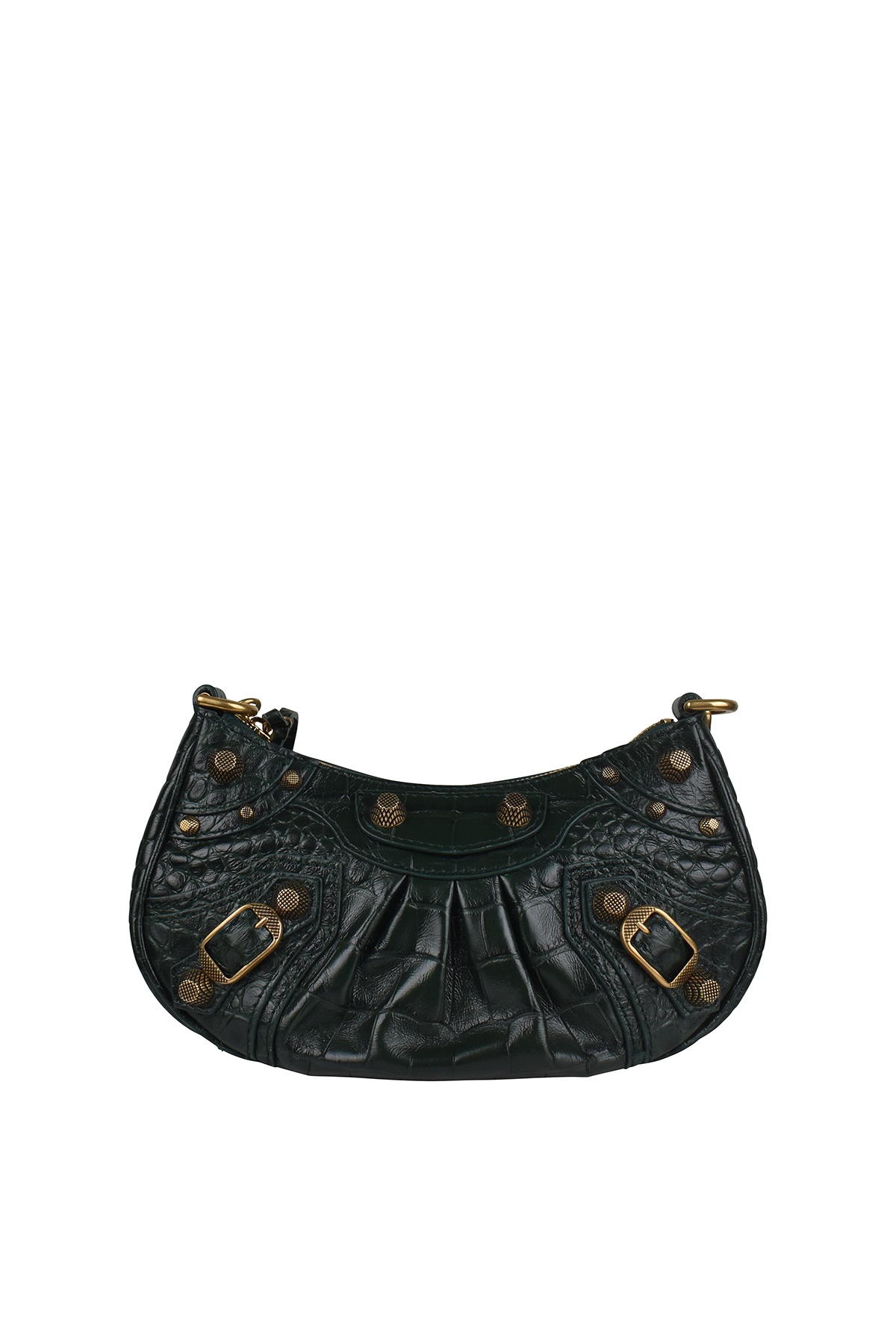 Balenciaga Cagole bag in green crocodile-embossed leather. Gold-tone metal trim. Thin, adjustable and removable shoulder strap. Removable gold chain. Main zipper closure. Leather card slots inside the bag. Dimensions: 21.5 x 11 x 3.5 cm. 100% leather. Made in Italy.
