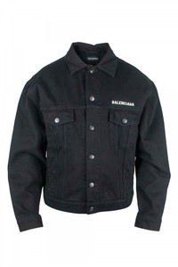 Balenciaga long-sleeved black denim jacket. White logo on chest. White "CREW" print on back. Front button closure. Two flap pockets on chest. Side pockets. 100% cotton. Made in Italy.