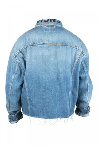 Balenciaga blue denim jacket. Black logo embroidered on collar. Side button pockets on chest. Front button closure. Side pockets. Ripped effect at waist. Made in Italy.
