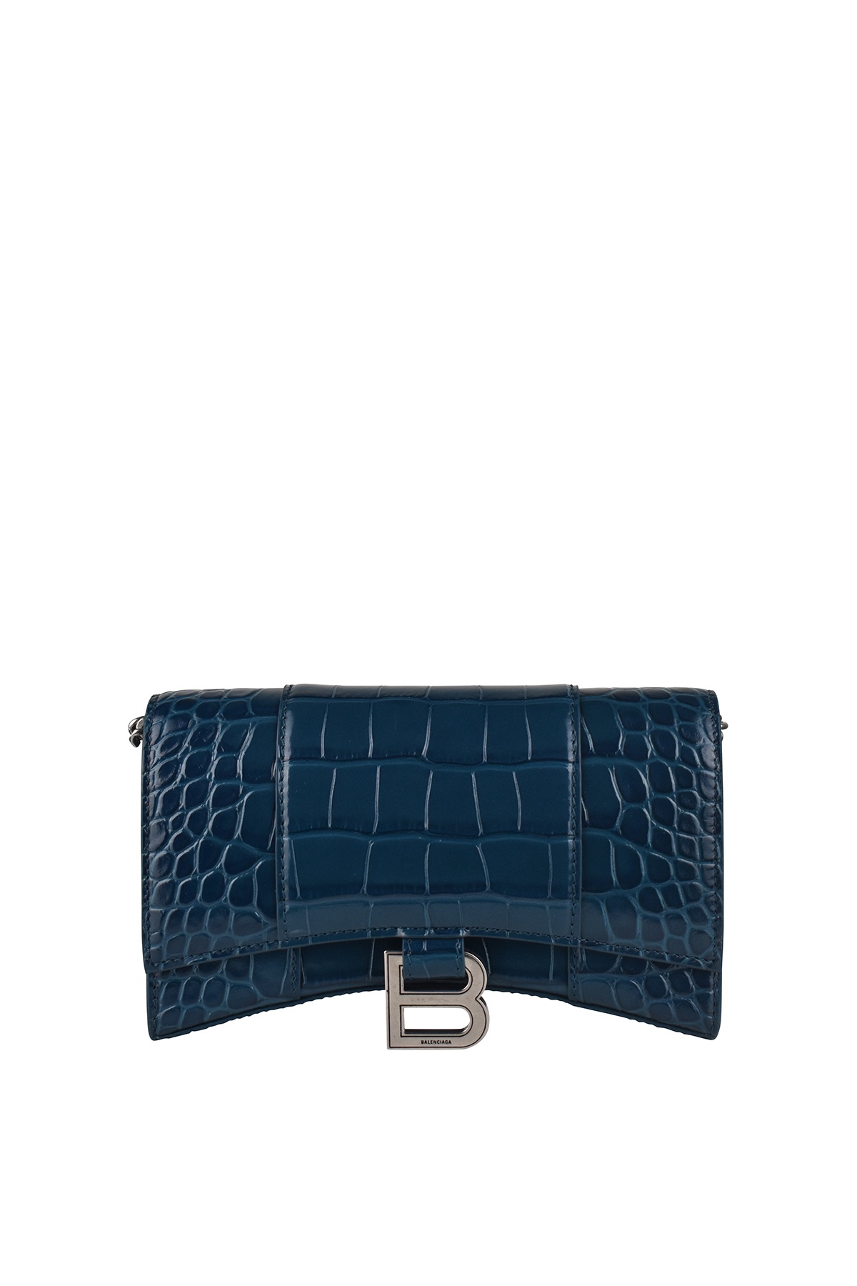 Balenciaga Hourglass chain wallet in dark green. Shiny crocodile-embossed calf leather. Signature B logo plaque. Silver-tone metal trim. Top flap. Adjustable shoulder strap. Dimensions: 19 x 12 x 4.8 cm. 100% leather. Made in Italy.