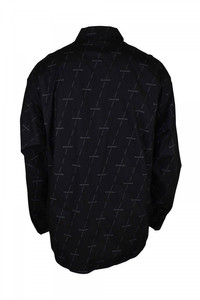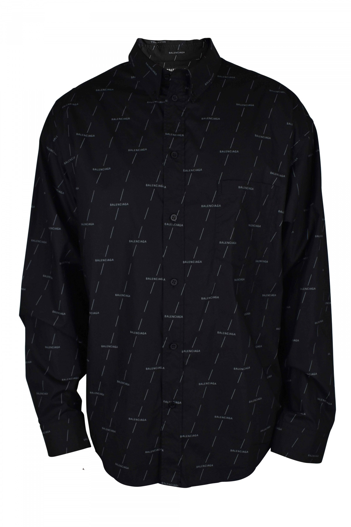 Black cotton Balenciaga monogrammed shirt. White logo all over the shirt. Dash design. Chest pocket. Classic collar. Black button closure. Long sleeves. 100% cotton.