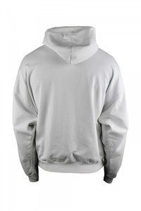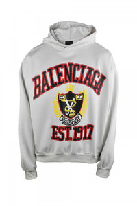 Balenciaga “College” hooded sweatshirt in off-white cotton. Graphic prints in red, yellow and black at center. Printed logo at center. Ribbed edges. Long sleeves. Slight rips. Unisex model.