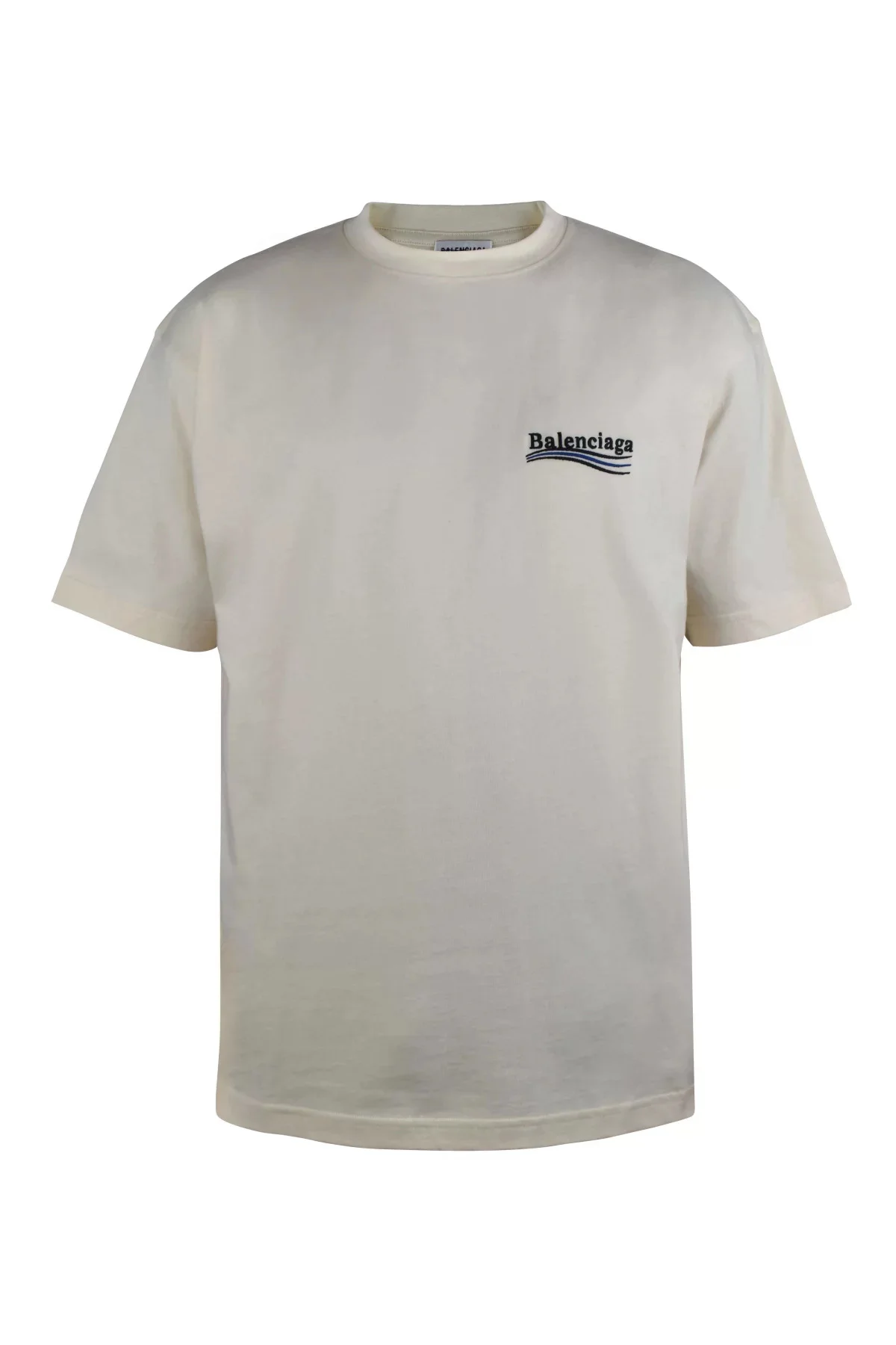 T-shirt Balenciaga in off-white cotton. Black and blue Balenciaga logo embroidered on chest and back. Round neck. Short sleeves. Unisex and oversize model.