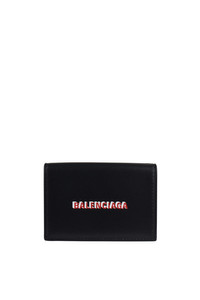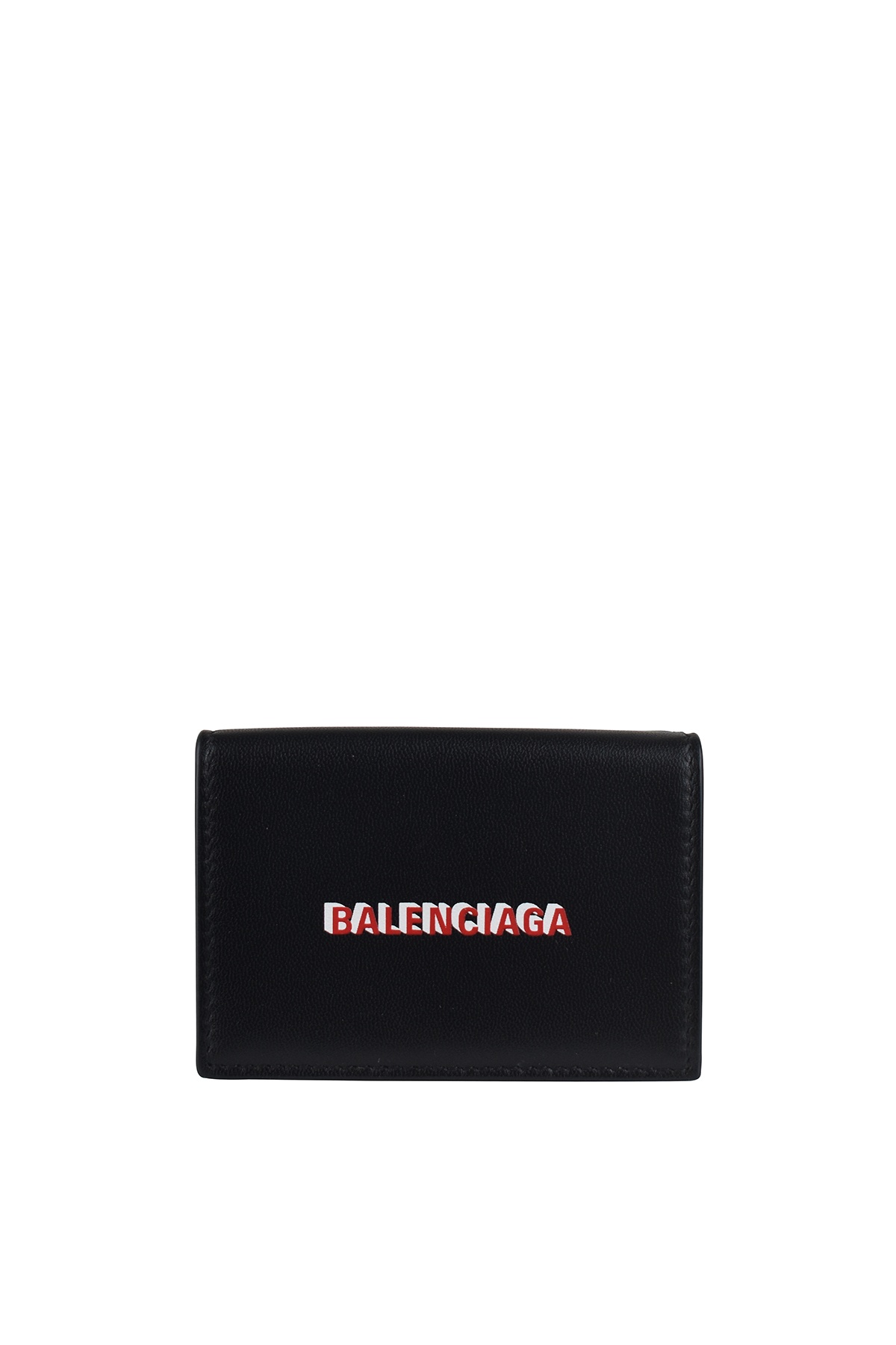 Balenciaga mini wallet in smooth black leather. White and red "Balenciaga" logo writing on front. Ticket pocket. 3 card slots. Integrated coin purse with snap closure. Dimensions: 6.9 x 9.4 x 3.8 cm. Made in Italy.