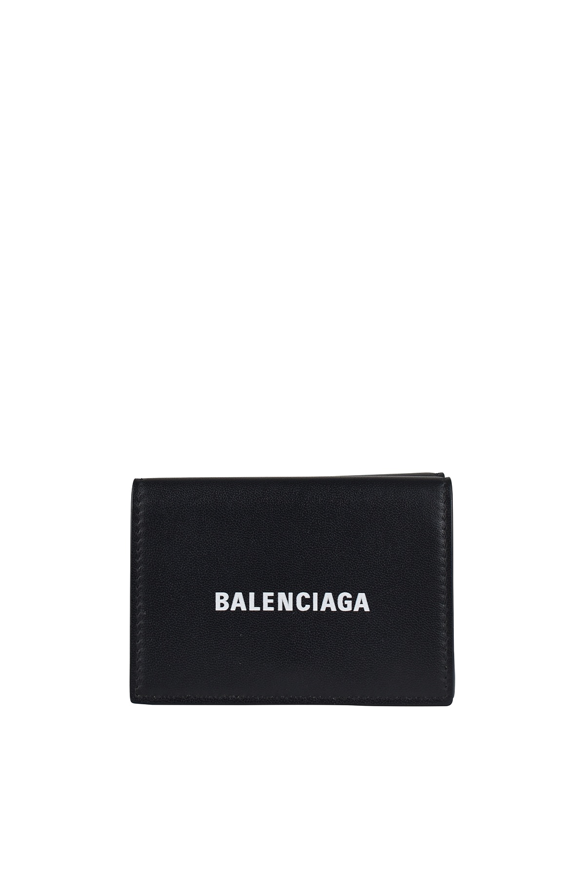 Balenciaga mini wallet in black grained leather. White "Balenciaga" logo writing on front. Rounded ends. Bill pocket. 3 card slots. Integrated coin purse with snap closure. Dimensions: 6.9 x 9.4 x 3.8 cm. Made in Italy.