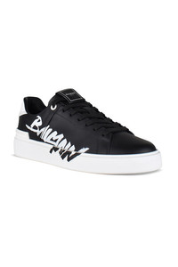 Balmain B-court sneakers in black leather. Black and white contrasting logo printed on the visible side. Tongue with black and white leather logo patch. Black lace-up closure. White leather counter with black logo. White rubber sole with tone-on-tone logo on heel. Made in Italy.