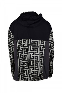 Balmain black and beige nylon windbreaker jacket. Black drawstring hood. White and black monogrammed logo on bottom and sleeves. Beige and brown details. Zip closure. Side zip pockets. Elasticated waist and sleeves. Long sleeves.