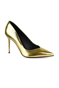 Balmain 100 mm metallic pumps. In gold leather. Pointed toe. High stiletto heel. Made in Italy.