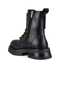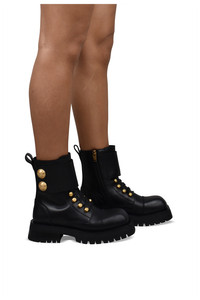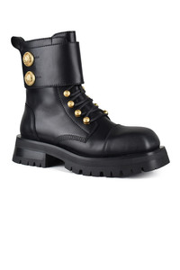 Balmain Ranger Army boots in black leather. Gold embossed button details on the ankle. Black laces at the front and decorative straps. Non-apparent side zip closure. Square toe. Back tongue. Made in Italy.