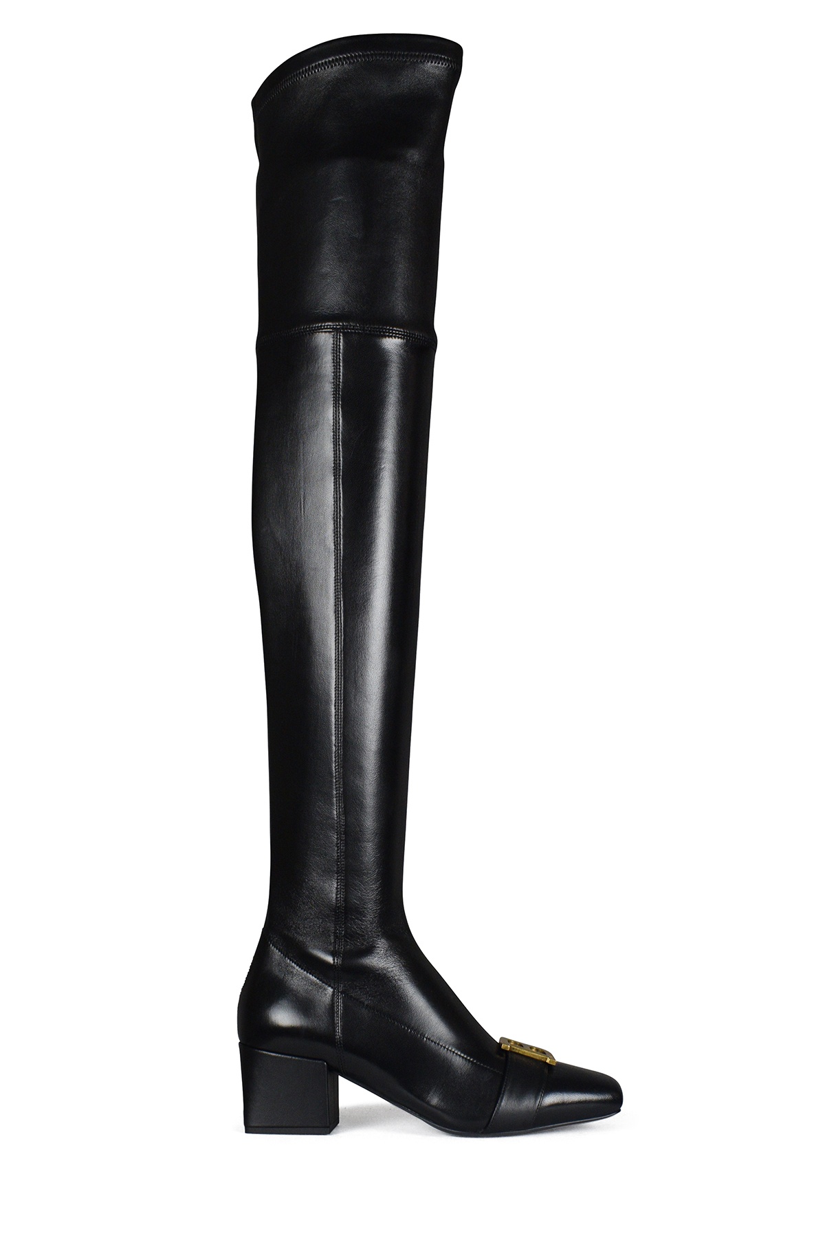 Balmain model Rosalyn thigh-high boots in black leather. Square point toe, knee length and block heel. Heel height 55 mm. Logo on the top of the thigh. Slip-on thigh boots with zip closure. 100% Leather. Made in Italy.