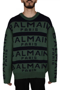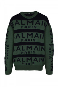 Balmain green wool sweater. Navy logo and details on front and back. Long sleeves. Round collar. Ribbed edges. Made in Italy.
