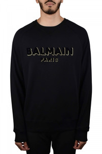 Balmain black cotton sweatshirt. Black velvet logo with gold outline on front. Crew neckline. Straight hem. Ribbed edges. 100% cotton.