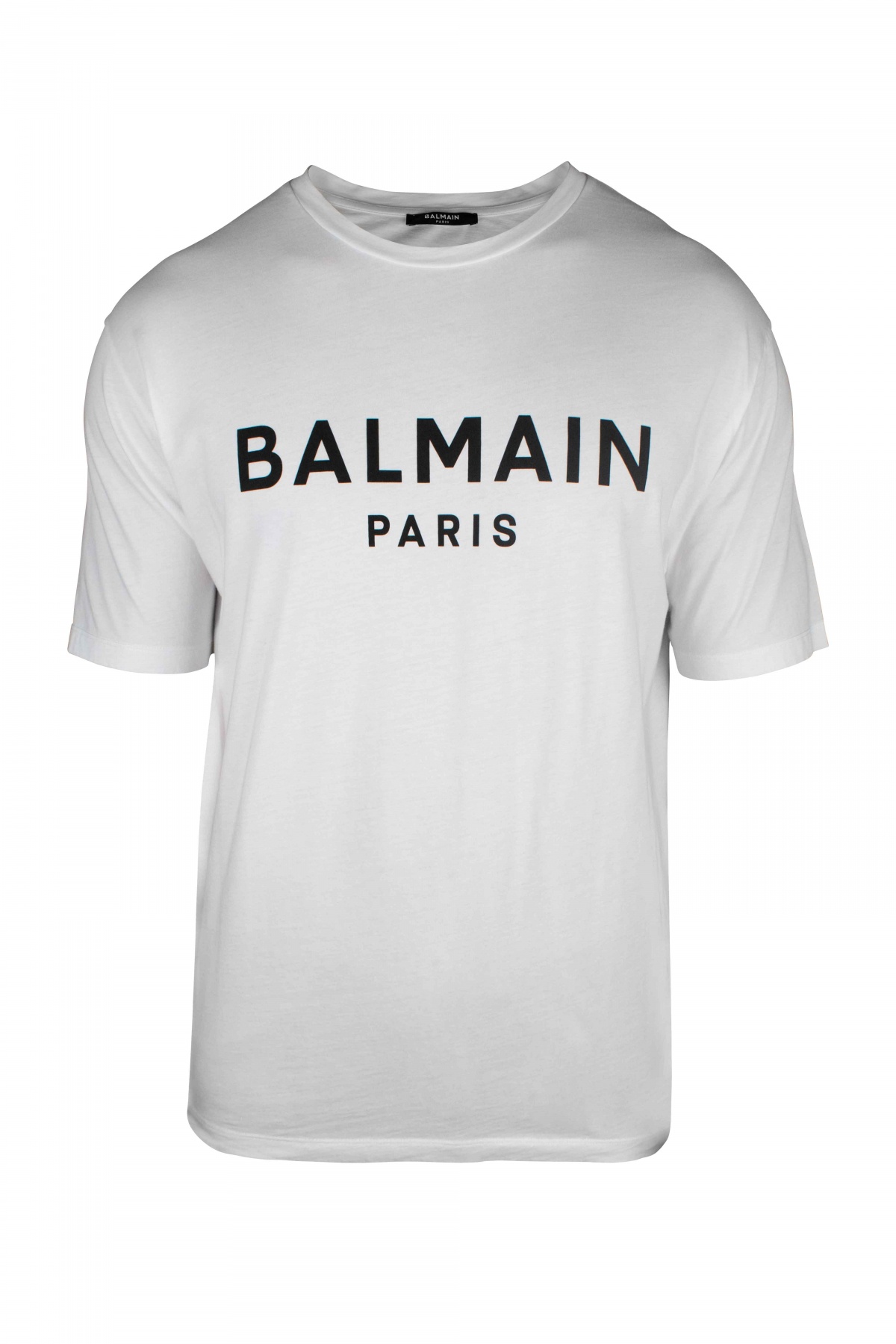 Balmain white T-shirt. Black logo printed on front. Short sleeves. 100% cotton.