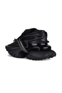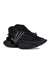Balmain Unicorn sneakers in black leather and neoprene. Black logo counter. Lion head snap fastener on top. Embossed black metal logo on tongue. Embossed logo on visible side. Thick black platform sole. Black laces.
