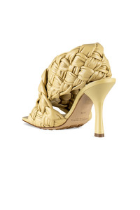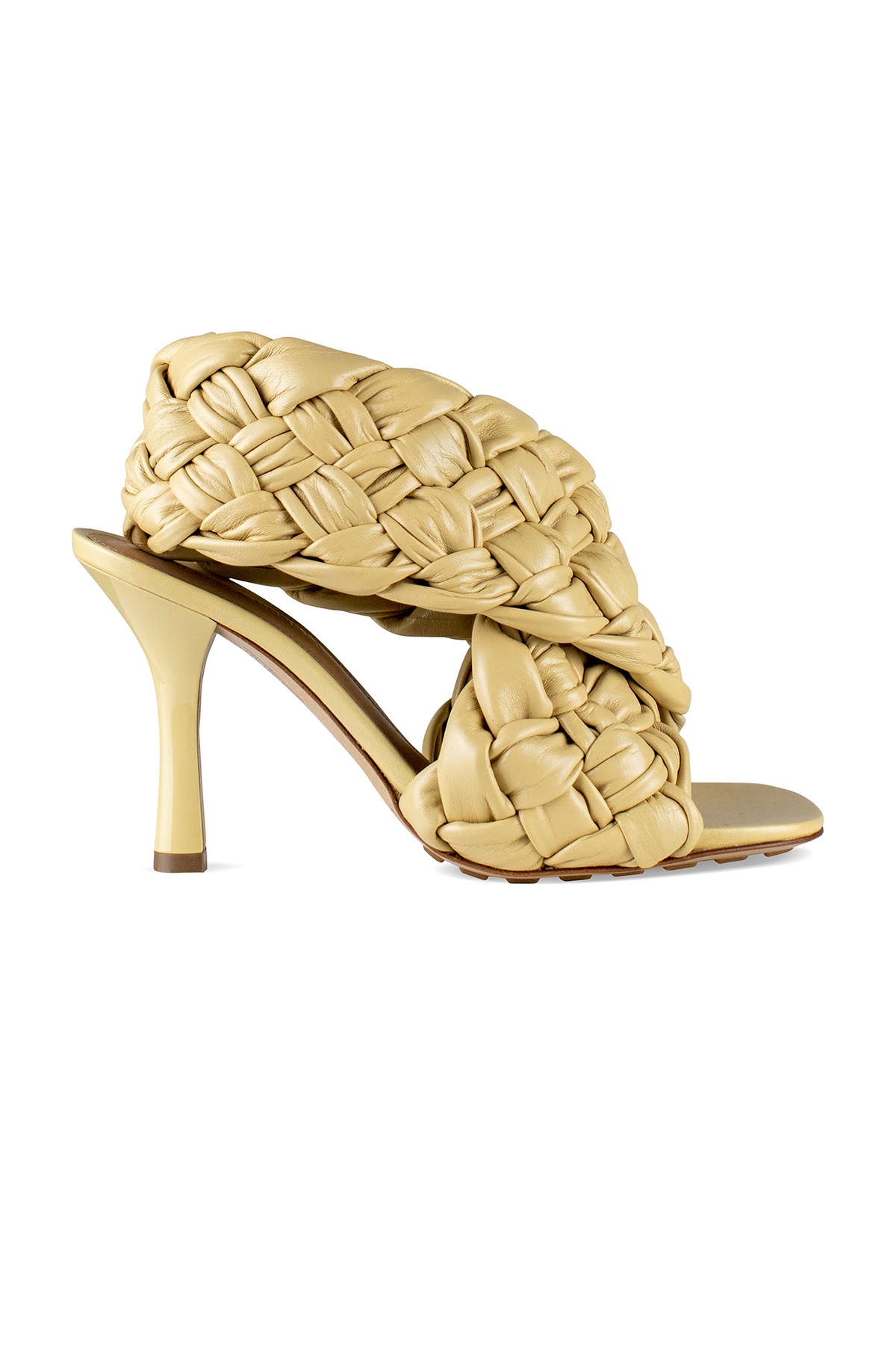 Ivory-yellow Bottega Veneta Board sandals. Oversized cross-over straps on top. Made of leather and designed in the "Intrecciato" style. Open-toe model. Heel height: 9 cm. Square toe. 100% leather. Made in Italy.