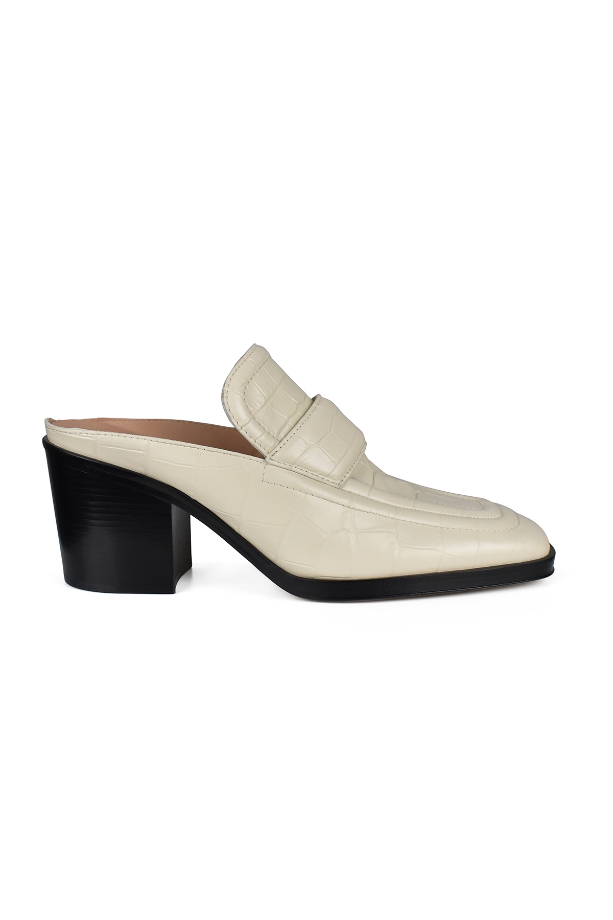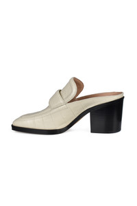 Off-white leather Bottega Veneta heeled mules. Crocodile effect. Square toe. Heel height: 6.5 cm. Black leather sole. Made in Italy.