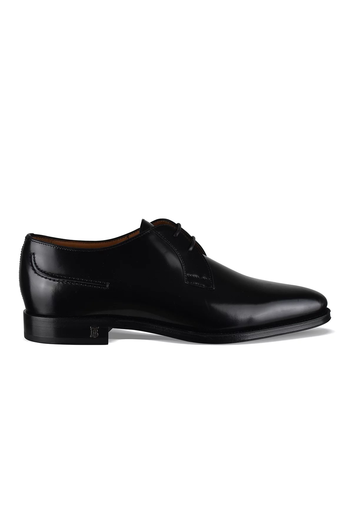 Simon Burberry derbies in black patent leather. Almond toe. Silver-plated TB logo on sole. Black lace-up closure. Leather sole. Made in Italy.