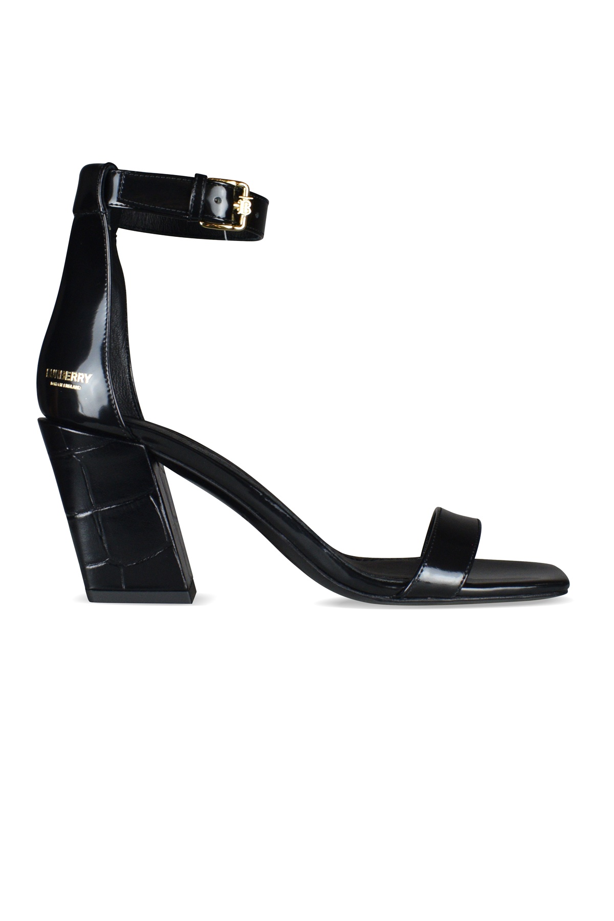Burberry sandals in black leather. Black heel with crocodile pattern. Gold engraved "Burberry" on the outside of the shoe. Strap with golden logo and toe cap. 100% leather. Made in Italy.