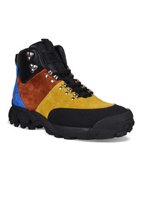 Multicolored leather and suede Tor boots by Burberry. Black, blue, mustard yellow and brown inserts. Embossed red logo on visible side. Black laces. Leather tongue with logo patch. Thick black rubber sole. Made in Italy.