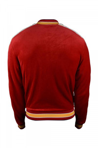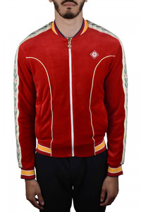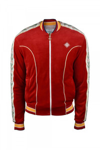 Laurel tracksuit jacket in Casablanca red cotton velvet. Iconic laurel-knit satin stripe along sleeves. Embroidered logo patch on chest. Elasticated ends. Yellow and white striped ends. Side zip pockets. Main zip closure.