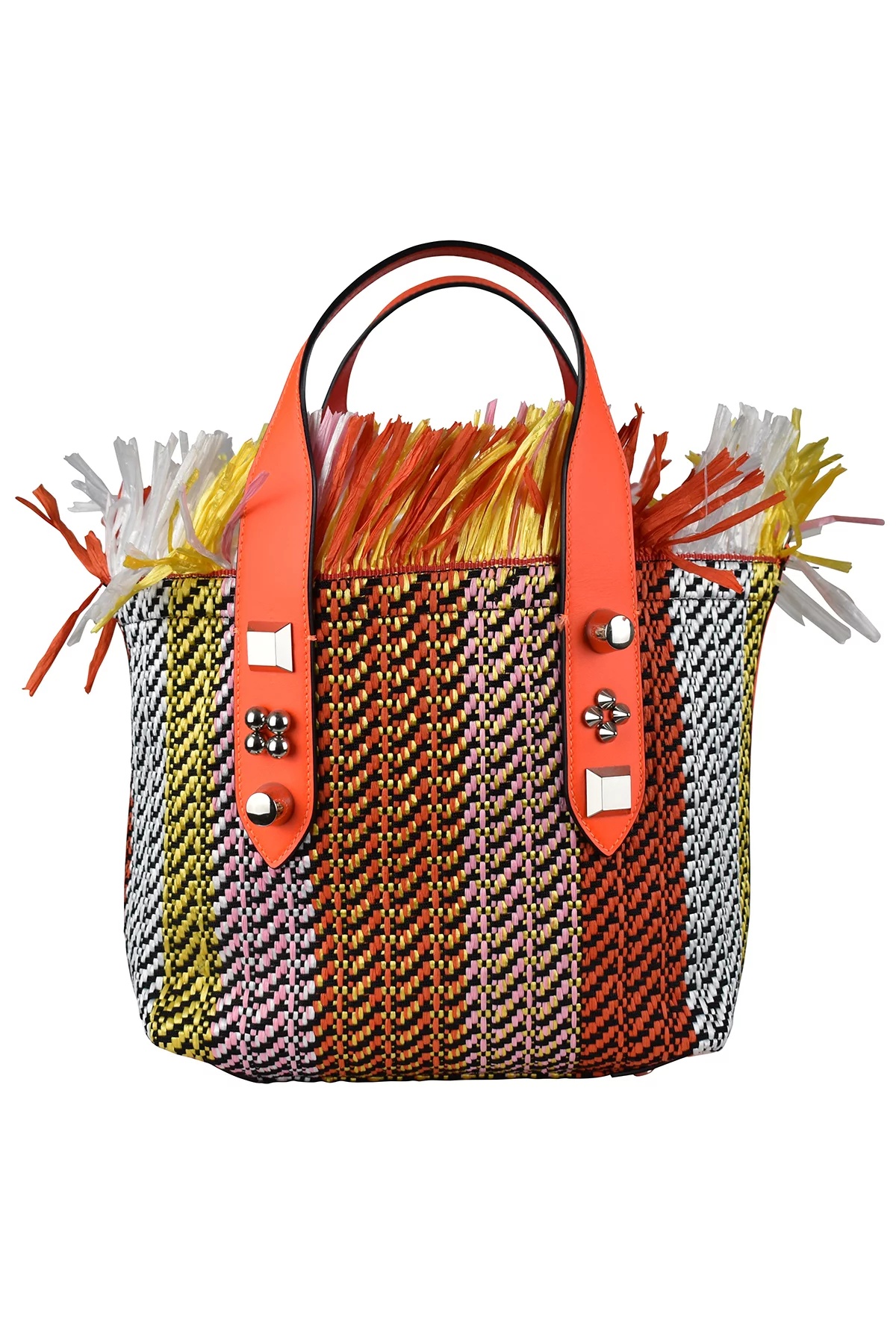 Frangibus Christian Louboutin small tote bag in multicolored raffia. Two orange leather handles adorned with 3 silver studs. Fringed top edge. Small internal leather pocket. Removable shoulder strap. Snap closure. Made in Italy.
