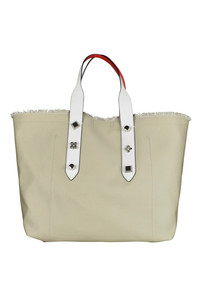 Frangibus Christian Louboutin tote bag in beige fabric. Two white leather handles adorned with 3 silver studs. Upper edge underlined by fringes. Effect black and red paint stains on the front. Writing: "From Christian Louboutin with love". Small internal leather pocket. Dimensions: 36 cm x 48 cm x 20 cm.