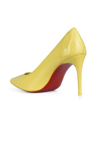 Christian Louboutin Sporty Kate 85 pumps. Light yellow patent leather. "CL" badge at back. Pointed toe. 8.5 cm stiletto heel. Made in Italy.