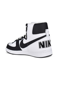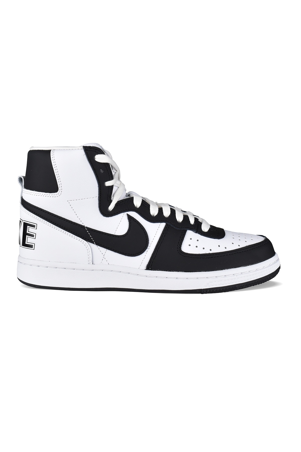 Comme Des Garçons Play x Nike Terminator high-top sneakers. Black and white leather. Signature swoosh logo on outer side. Nike X CDG logo on heels. Perforation detail on toe. Tongue with logo patch. Lace-up closure. Rubber sole.