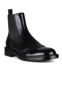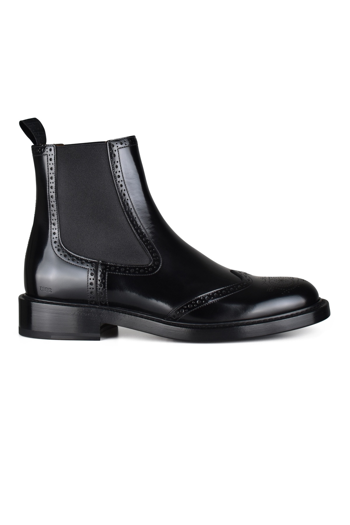 Dior Evidence Chelsea boots in black leather. CD logo on the toe of the shoe. Black elastic bands on the sides. Black fabric tongue at the back in a slip-on style. Polished calf leather with decorative perforations. Leather sole. Made in Italy.
