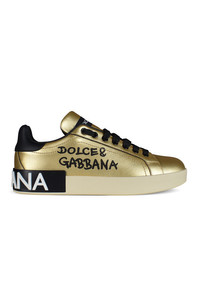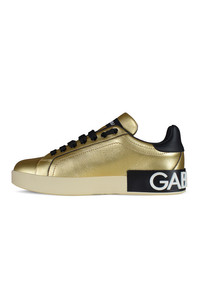 Portofino Dolce&Gabbana sneakers in gold leather. Black Dolce&Gabbana inscription printed on the side. Black leather counter in contrast. Black flat laces. Leather insole with logo label. Logo rubber outsole with black lamé leather insert and white micro-injected logo. 100% calf leather. Made in Italy.