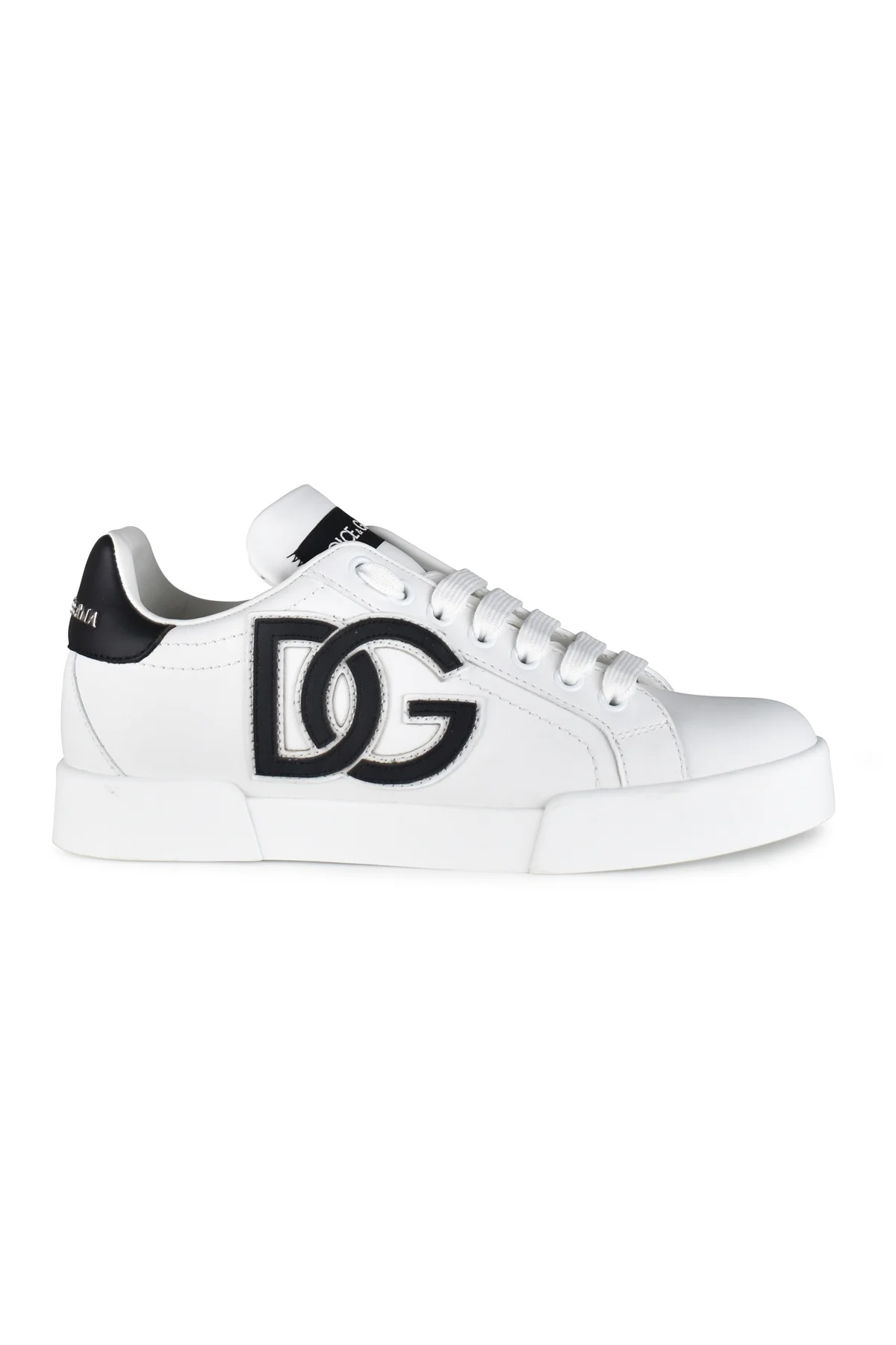 Portofino low top sneakers by Dolce&Gabbana in white leather. Black embossed logo print on the side. Black leather counter with logo. Black logo patch on the tongue. White flat laces. White rubber outsole. Made in Italy.