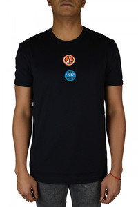 Dolce & Gabbana T-shirt in black cotton. Round patch with orange peace symbol. Blue DG logo round patch. Short sleeves. Round neck. 100% cotton. Made in Italy.