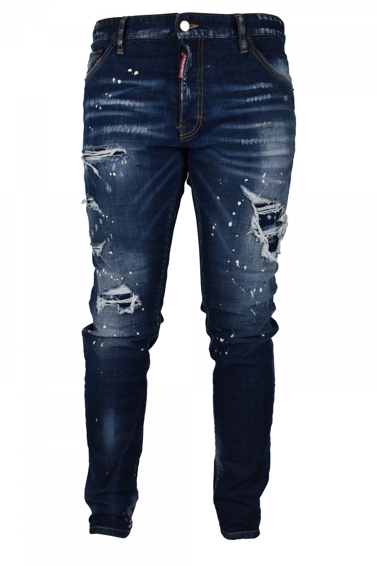 Cool Guy Dsquared2 faded blue jeans with white paint stains. Ripped and faded effect at front and back. Light brown patch with red frame at back. Branded logo on the label. Maple leaf, "Canadian Label", and red writing. Three side pockets and two back pockets. Label with red logo on the front fly. Four button closure. Yellow stitching. 98% cotton and 2% elastane. Made in Italy.