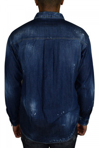Blue denim shirt from Dsquared2. Printed "Icon" at the front in neon yellow. Classic collar, button closure, button cuffs. Aged effect. Soft stretch cotton. Cotton: 98%, elastane: 2%. Made in Italy.