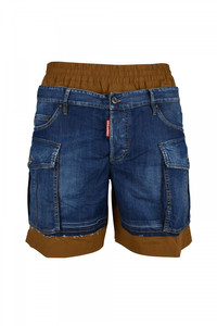 Denim and fabric shorts by Dsquared2. Bi-material yoke. Over-the-shoulder boxer effect. Denim front. Back in brown fabric. Cargo-effect side pockets. Denim back pockets. Elastic waistband. Red logo label on front fly. Button closure. Belt loops. Made in Italy.