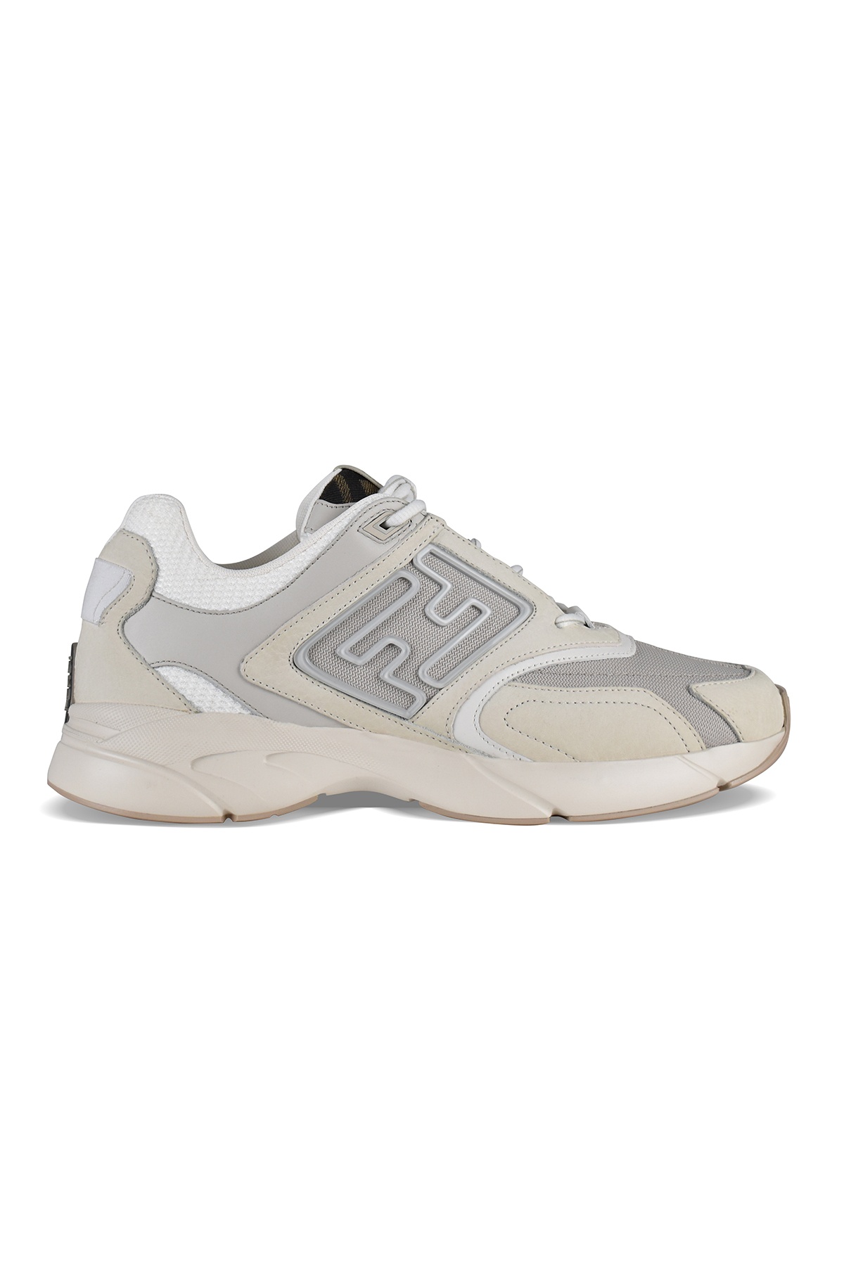 Fendi Faster sneakers in white nubuck. Leather details. Tone-on-tone technical fabric. Embossed FF motif on sides. Wavy running sole with FF on toe. Brown and tobacco FF fabric details on tongue. Made in Italy.