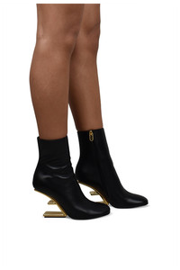 Fendi First ankle boots in smooth black leather. Diagonal F-shaped high heel in gold metal. Zipper closure on the side not apparent. Heel height: 9.5 cm. Rounded toe. Made in Italy.