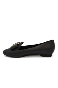 Salvatore Ferragamo round-toe black leather slippers. Bow and golden flower heel. Heel 1 cm. Made in Italy.